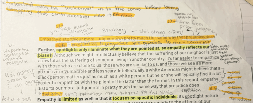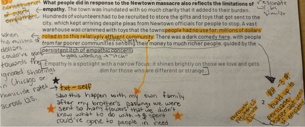 Strong annotations, including text to text connections, helped me respond to reading questions that further helped me craft my final essays. When annotating in high school, I mostly only made understanding marks to define a word, jotted down questions, made shallow connections, or highlighted important phrases. Over the semester, I have been able to challenge the author or extend on their ideas while observing their rhetorical choices through these new annotation strategies. Many notes fill the margins of my class handouts in a somewhat organized way, thanks to the symbols we’ve used. The attached image shows my continuation of leaving notes to help my understanding when flipping back through Bloom’s essay, “Is Empathy Overrated?” while I also make a deep text to self connection. When my brother passed away, people sent hundreds and hundreds of flowers to us as an act of empathy, but like the town of Newton, the money spent could’ve been put towards those who actually needed it. I also acknowledge Bloom’s effectiveness with the Newton massacre example, where he builds up his argument on empathy’s dangers through this paragraph and the two previous ones.