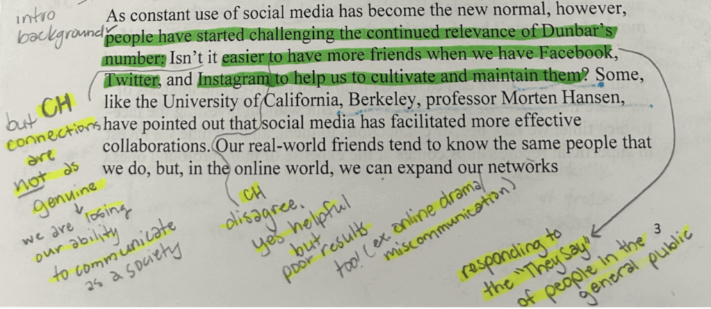 The underlined phrase shows my use of a signal phrase followed by green highlighting of paraphrasing and partial quoting of experiment findings. I then connect this back to my claim through the yellow highlighting and am about to pull my personal experience into the next paragraph. Additionally, in our group paragraph from class, I brought in a template phrase from “They Say, I Say.” Stating the template phrase, “this is not to say that…” helped reinforce and conclude our argument that meaningful connections can only be maintained through face to face interactions. When I am reading essays, such as “Shitty First Drafts” by Anne Lamott, I notice the writers use the approach of addressing public opinions, or the “they say,” and then bring in their own voice. Lamott cleverly uses a run-on sentence to explain the misconceptions we have about famous authors. I note this rhetorical choice and its effectiveness, noticing this thanks to having read “They Say, I Say.”