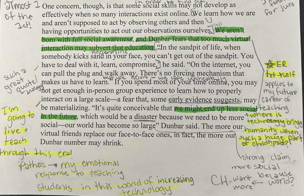 The green highlighted sentences are the ones that resonated with me regarding how the constant influence of technology will impact children throughout their youth into adulthood. I mark this text to self connection with “ER” and note that this issue directly applies to my future career in the education field. I will continuously face the challenges of teaching in a world filled with social media, artificial intelligence, and limited face to face social interactions, as Konnikova touches on in her last paragraph. Similarly, when Konnikova explained the idea that our five closest people can shift over time, I labeled a star and text to self connection too. I have seen my closest five people drift in and out of my life, especially when changing hockey teams and transferring high schools my junior year.