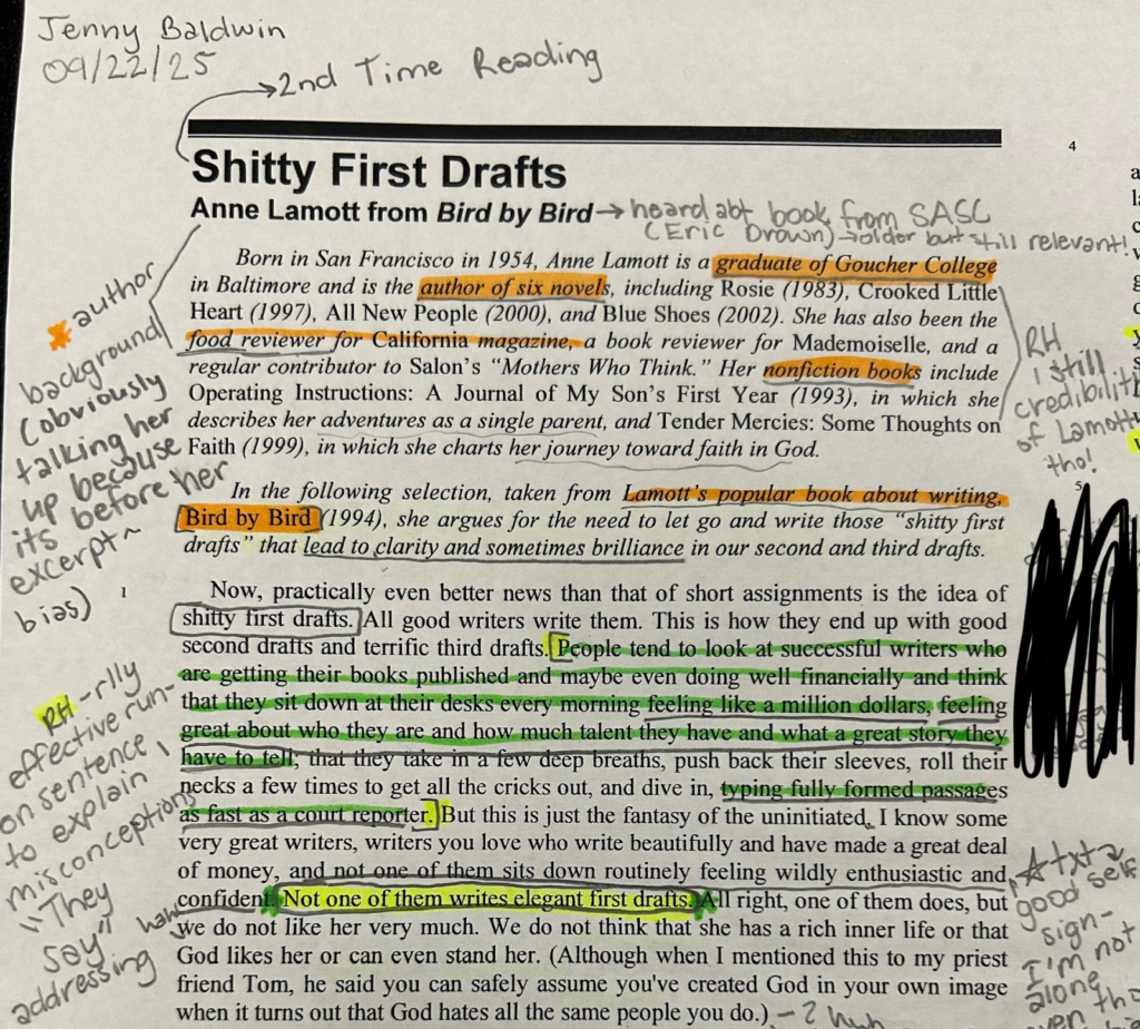 This image also covers the importance of previewing a text to have an understanding before diving into it. Before Lamott’s opinion on first drafts is introduced, the reader gets a background on her. This not only provides credibility to an author but helps us understand potential bias and their beliefs. Taking five minutes to do a quick background check on an author has helped me settle into what I’m reading and further appreciate their work.