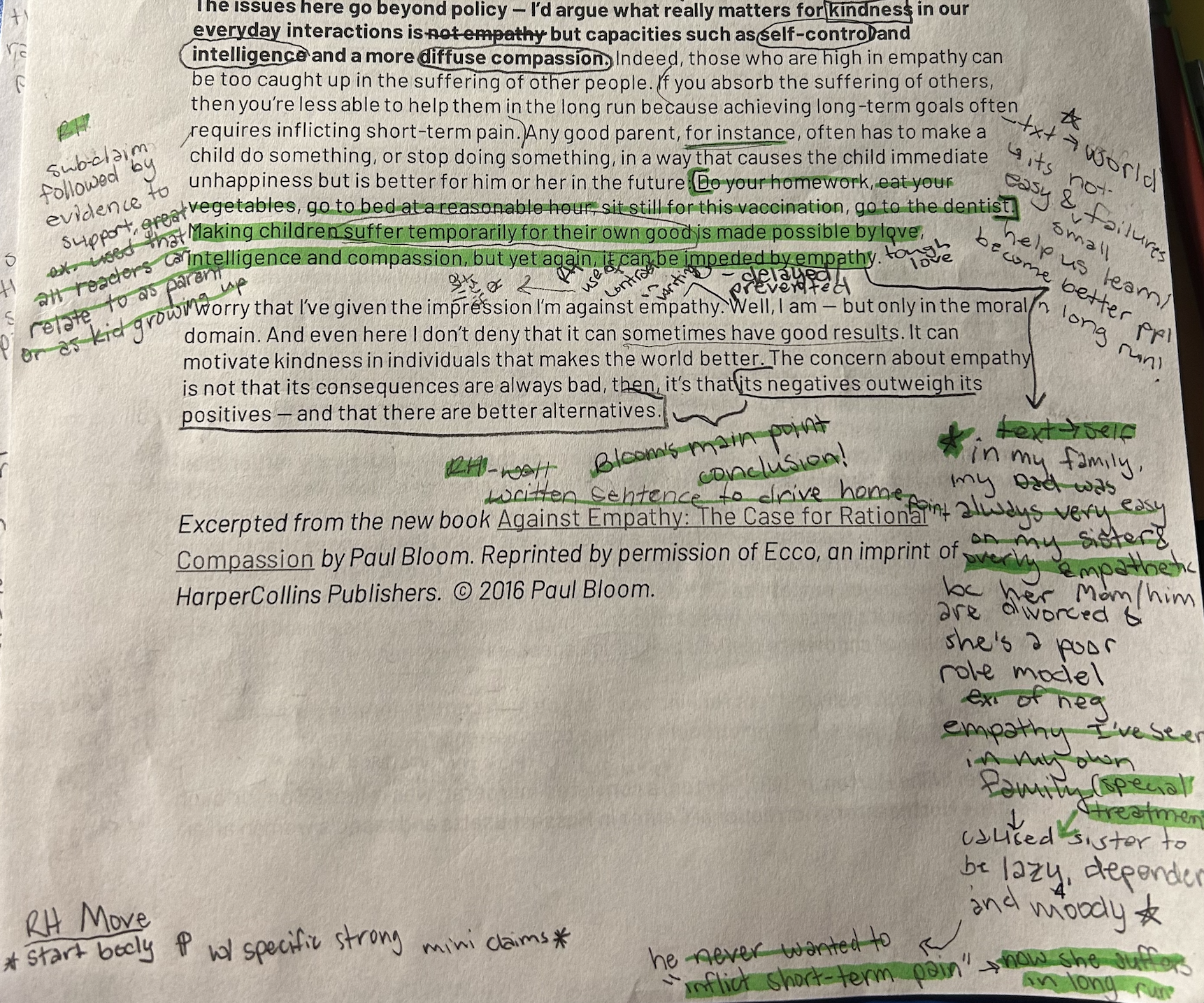 Strong annotations, including text to text connections, helped me respond to reading questions that further helped me craft my final essays. When annotating in high school, I mostly only made understanding marks to define a word, jotted down questions, made shallow connections, or highlighted important phrases. Over the semester, I have been able to challenge the author or extend on their ideas while observing their rhetorical choices through these new annotation strategies. Many notes fill the margins of my class handouts in a somewhat organized way, thanks to the symbols we’ve used. The attached image shows my continuation of leaving notes to help my understanding when flipping back through Bloom’s essay, “Is Empathy Overrated?” while I also make a deep text to self connection. When my brother passed away, people sent hundreds and hundreds of flowers to us as an act of empathy, but like the town of Newton, the money spent could’ve been put towards those who actually needed it. I also acknowledge Bloom’s effectiveness with the Newton massacre example, where he builds up his argument on empathy’s dangers through this paragraph and the two previous ones.